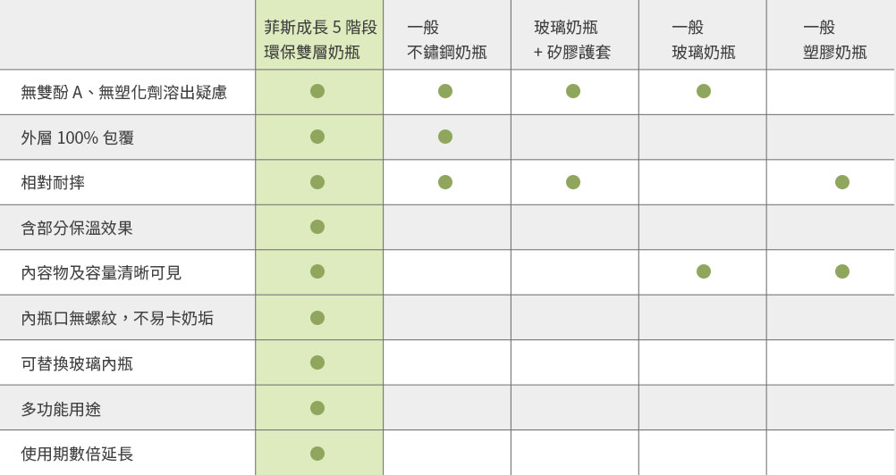 菲斯成長5階段玻璃內瓶,附矽膠瓶塞,可輪流替換的設計,讓菲斯成長五階段奶瓶更加經濟與便利,是對環境更友善的產品。適用標準合格的奶瓶溫熱器加熱。除了裝填沖泡的乳品,也是儲存母乳,或保存您預先攪拌好的自製嬰兒食品及一般副食品的理想容器。